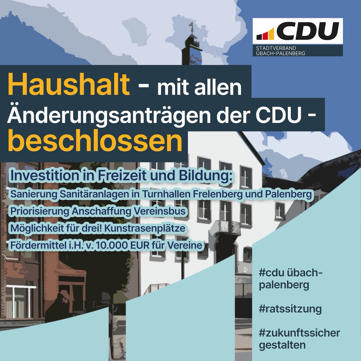 mehrHaushalt beschlossen ? wichtige Projekte auf den Weg gebrachtGute Nachricht aus dem Rat: Der Haushalt ist beschlossen. Damit besteht endlich Planungssicherheit für unsere Stadt.Besonders erfreulich: allen unserer zuvor eingebrachten Änderungsanträge zum Haushalt wurden mit großer Mehrheit zugestimmt.Konkret bedeutet das:? Sanierung der Sanitäranlage der Turnhalle Frelenberg und Sanierung der Sanitäranlage und Funktionsräume der Turnhalle Palenberg ? Einsparungen bei der Weihnachtsbeleuchtung ? stattdessen 10.000 ? Fördermittel für unsere ehrenamtlichen und gemeinnützigen Vereine - Wir fördern weiterhin Engagement und Ehrenamt? Deutliche Verbesserungen bei den Sportanlagen: Statt eines Platzes sind nun die Weichen für die Realisierung von drei Kunstrasenplätzen gestellt? Unser Antrag aus dem letzten Jahr geht in die Umsetzung, Erläuterungen im Haushalt um den Vereinsbus ergänzt -Anschaffung eines Fahrzeugs zur Nutzung von Vereinen und Ehrenamt? Vorgezogene Sanierung des Benno-Werth-Hauses - hier ist es uns wichtig, dass wir die städtische Infrastruktur weiterhin in gutem Zustand erhalten.Das zeigt: Mit klugen Entscheidungen, dem richtigen Timing bei Fördermitteln und klaren Prioritäten investieren wir gezielt in unsere Infrastruktur, Bildung und Freizeit. Übach-Palenberg soll weiterhin lebenswert bleiben. Wir setzen uns dafür ein.Weitere wichtige Themen aus der Sitzung folgen in den nächsten Tagen.