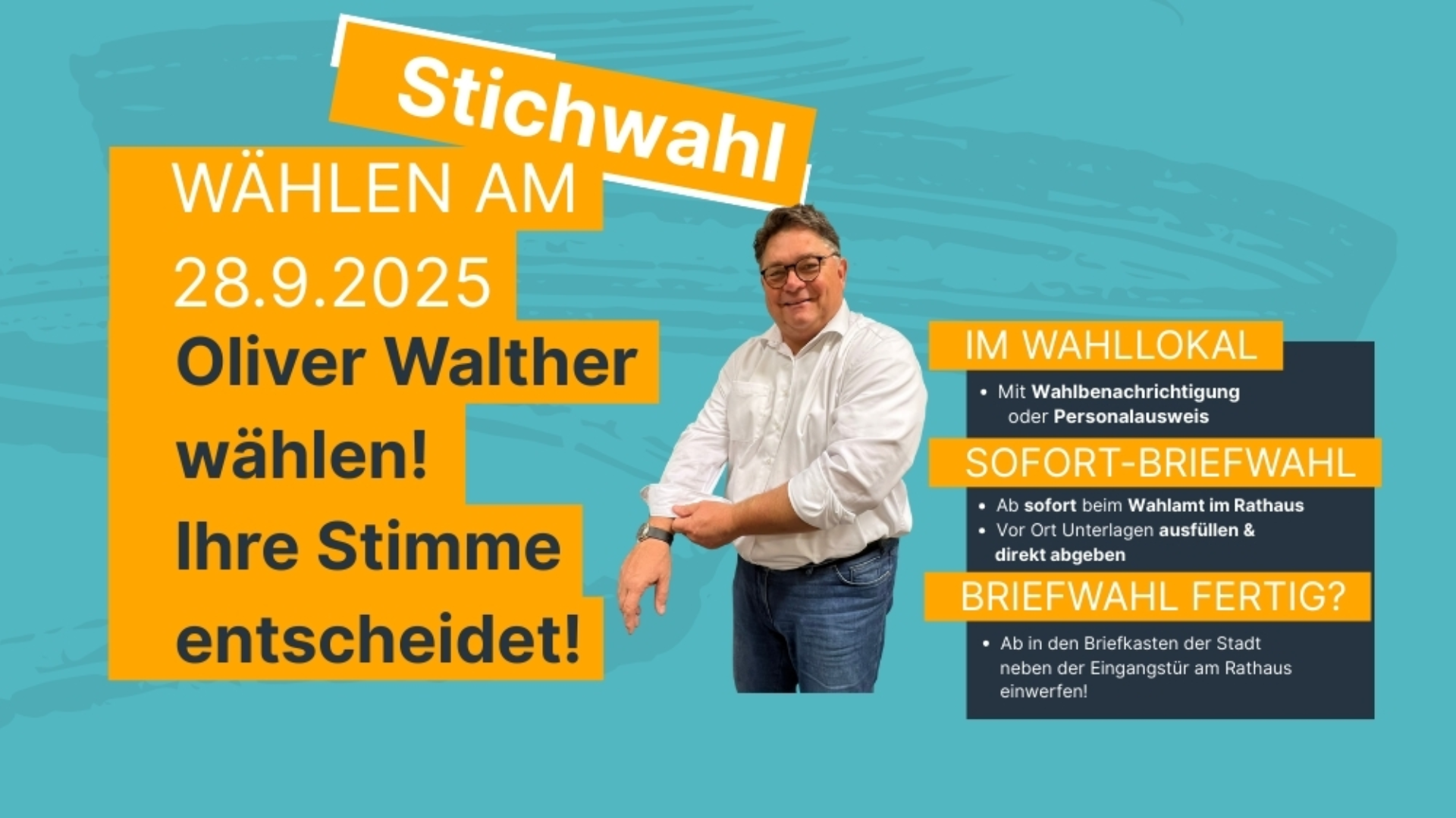 mehrIch möchte allen DANKE sagen, die mir ihre Stimme und ihr Vertrauen geschenkt haben. Leider ist das Wahlergebnis anders ausgefallen, als ich es mir gewünscht hätte. Nichts desto trotz ist es mir eine Ehre gewesen, mich als Bürgermeister 5 Jahre lang mit ganzer Kraft für unsere Stadt einzusetzen und uns auch über die Grenzen hinweg in unseren Nachbarländern zu vertreten. Ich danke allen, die mich in dieser Zeit mit Rat und Tat unterstützt haben und wünsche meiner Nachfolgerin viel Erfolg in diesem anspruchsvollen Amt. Ihr und euer Oliver Walther